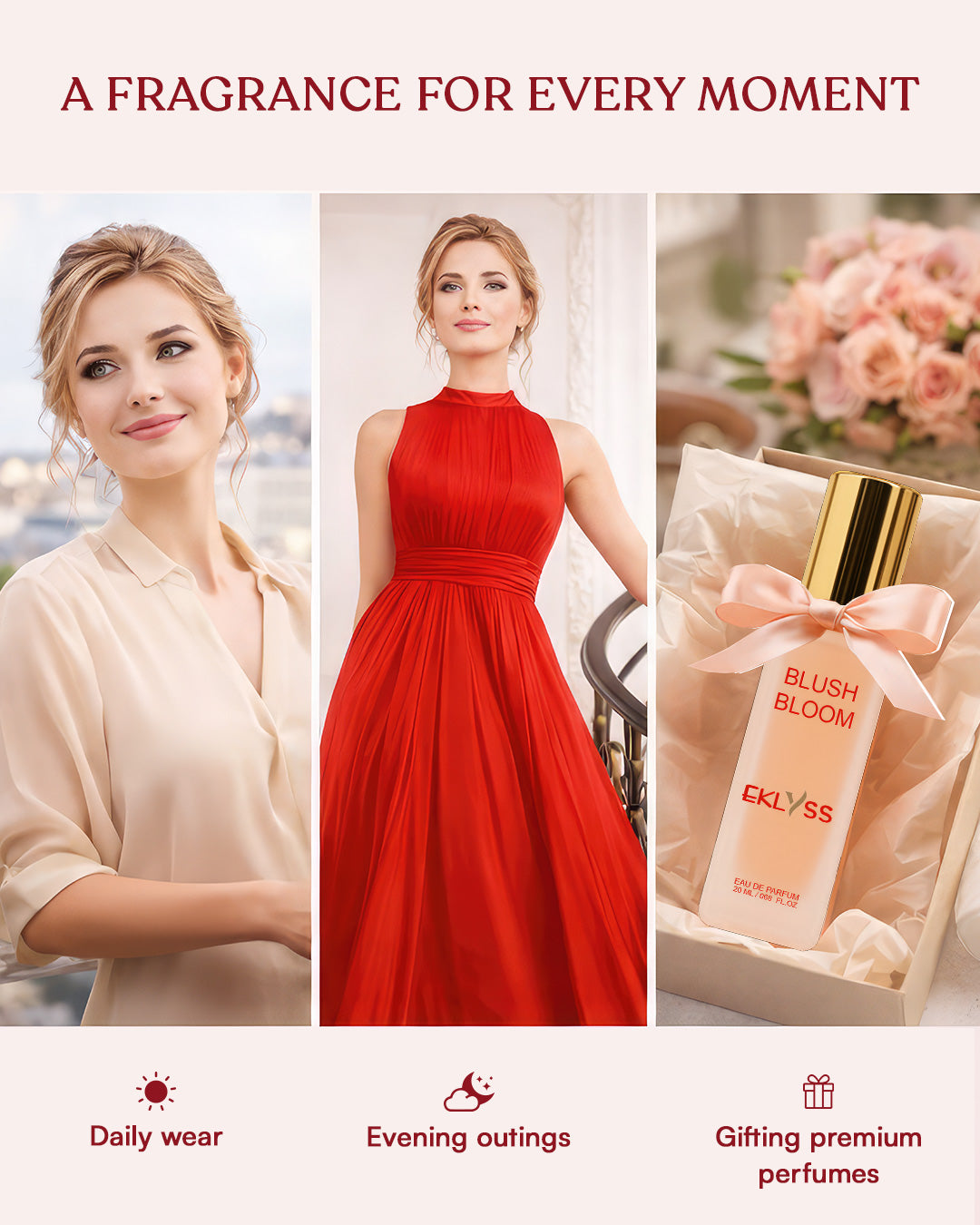 Blush Bloom is a Juicy, Romantic, floral Eau de Parfum crafted for those who wants delicate and romantic fragrance. It opens with a sparkling mandarin orange burst, moving into a blooming heart of pink peony, peach, apricot, and damask rose, creating a fresh yet warm feminine aura. The fragrance settles into a clean and sensual white musk base, creating a long-lasting irresistibly charming. ideal for both day and evening wear. With a powerful 20% concentration, Blush Bloom offers long-lasting performance wrapped in signature Eklyss luxury.
