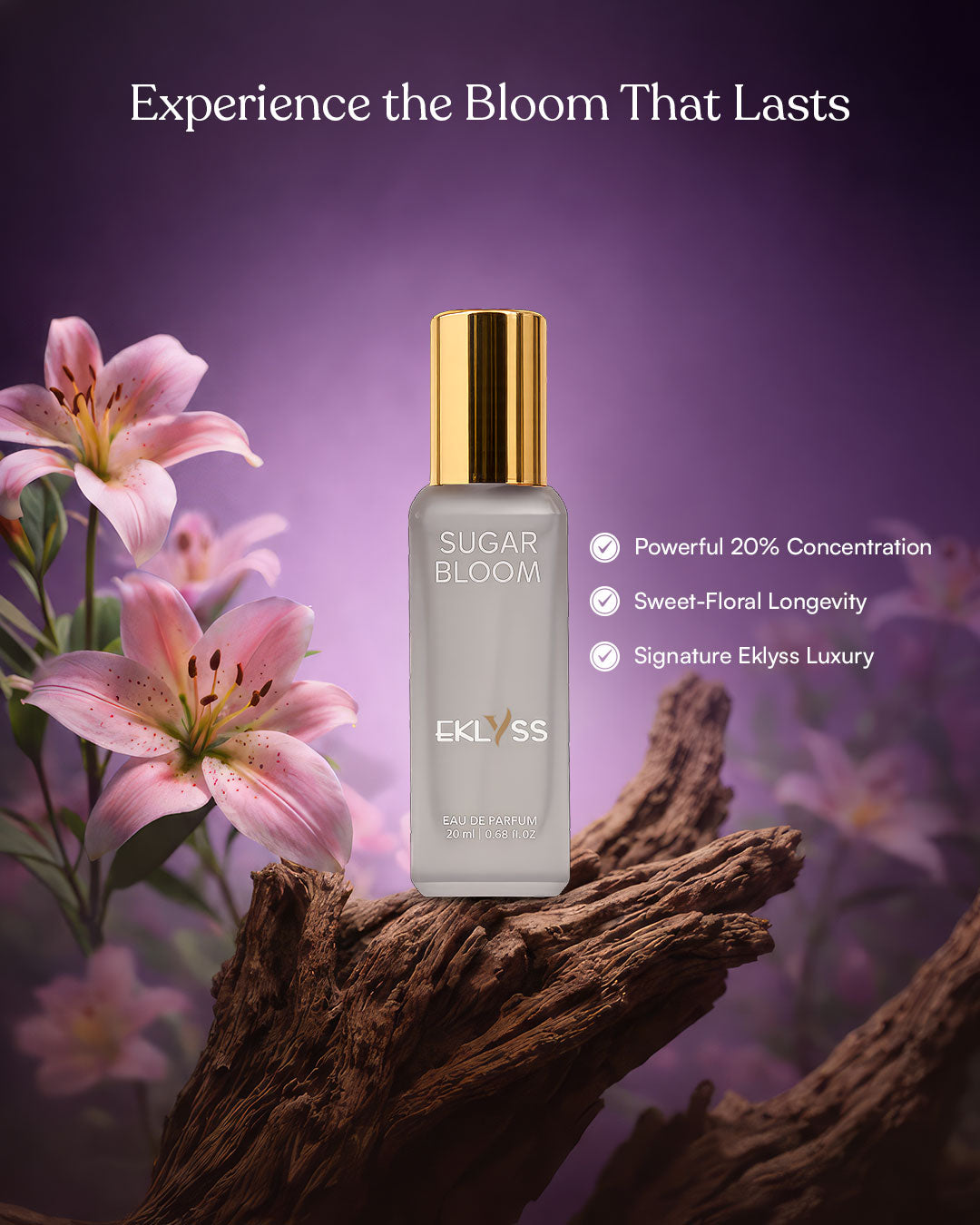 Sugar Bloom is a dreamy ode, warm, creamy vanilla Eau de Parfum crafted for those who wants soft and sweet fragrance. It opens with a comforting burst of pure vanilla, followed by the gentle elegance of vanilla orchid, unfolding like a delicate floral bloom on warm skin. Finally, a touch of ozonic freshness adds a clean, airy lift, balancing the sweetness. ideal for both day and evening wear. With a powerful 20% concentration, Sugar Bloom offers long-lasting performance wrapped in signature Eklyss luxury.