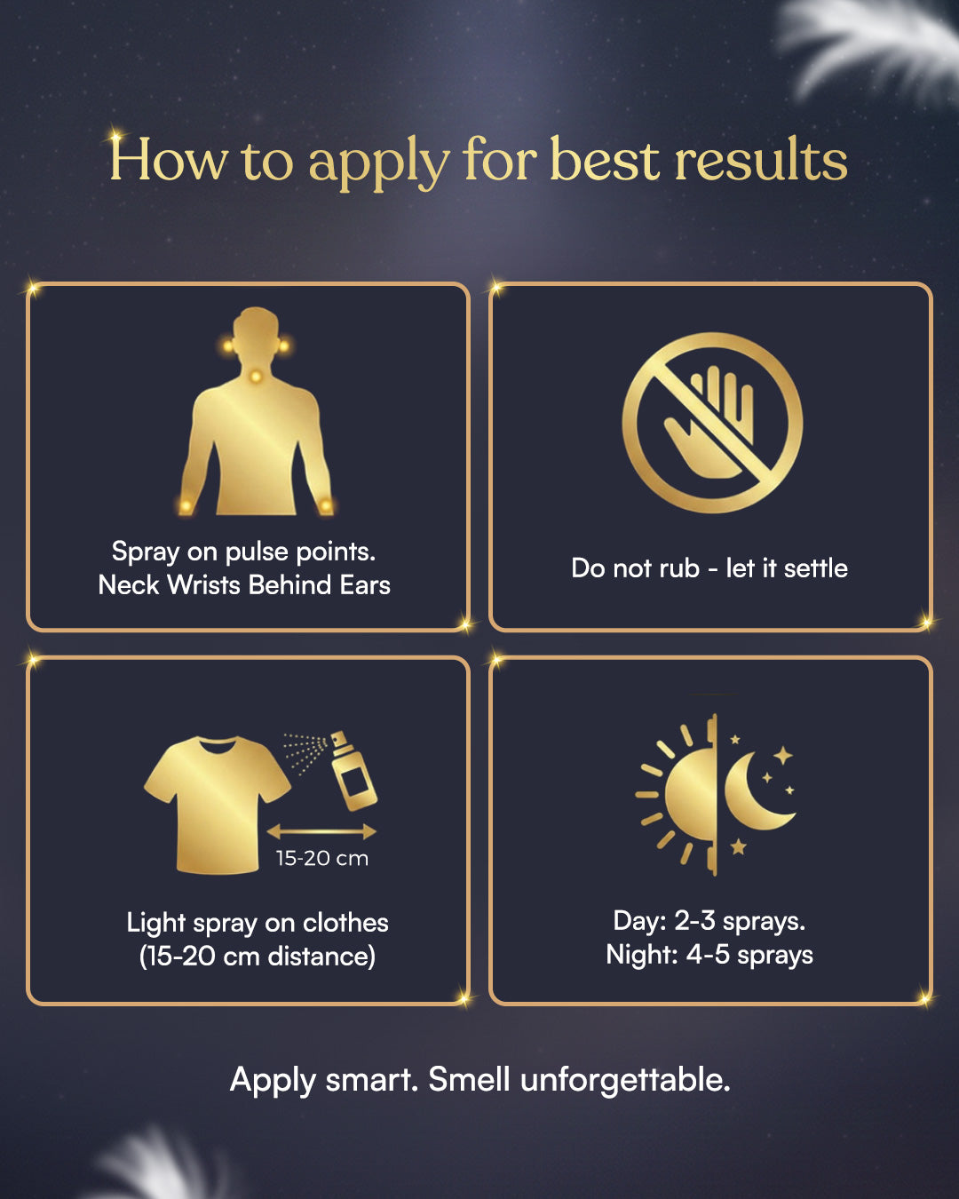 • For best results hold the perfume 3-6 inches away from the skin